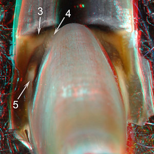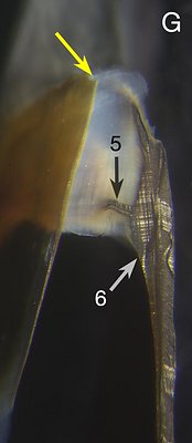 The Wedge (3) in D. laciniosa (above) is unusual in being very large and thick, appearing much like the "Shoulder Blade" of Tripartite beaks, especially that of onychoteuthids. The crease (5) in the posterior pigmentation of the young D. laciniosa recalls the leaf-shaped pigmentation in young Tripartite beaks with a crease that lies at the posterior junction of the free and fused parts of the shoulder. A distinct Palatoshoulder Ridge is present (2) but has not covered much of the Shoulder at this size. With the exception of the distinct lateral Shoulder Blade, this beaks looks very much like a Tripartite beak. However, only cuts through the Shoulder of D. laciniosa beaks will reveal how similar it is to Tripartite beaks.