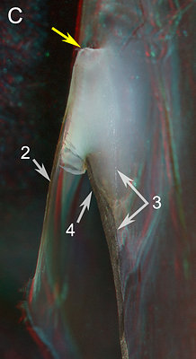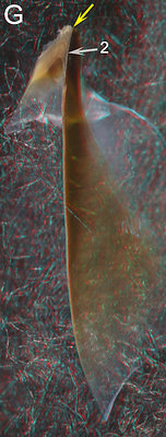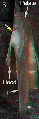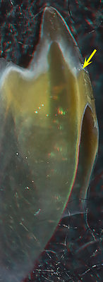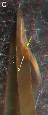 ARROWS: 1 - Line between the two parts of the Shoulder Blade. 2 -Hyaline Matrix (?). 3 - Palatoshoulder Ridge. Yellow arrows - Point to the same spot on all beaks to aid viewer orientation.The cut through the shoulder shows that the thick Shoulder Blade occupies most of the Shoulder. A peculiar middle layer (2) exists between the Palatoshoulder Ridge (3) and the Inner Component of the shoulder Blade. We assume this partially pigmented layer is a reduced Hyaline Matrix that, strangely, seems to blend into the structures on either side. A thick layer of hyaline material covers the anterior end of the Shoulder Blade and a thin layer covers the lateral surface of the Shoulder Blade (not visible in the photograph).