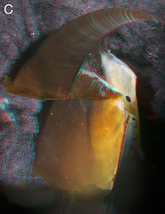 Figure. A - Medial view of the anteroventral corner of the Lateral Wall (the mirror image of this portion in Fig. A of the Shoulder cuts). The anterior end of the beak is at the left of the image where the thick, opaque white Hyaline Matrix is. B - Photomicrograph (2D), anterior view taken perpendicular to the cut surface. C - Lepidoteuthis grimaldii, 22 mm URL, from sperm whale stomach. Oblique view with the anterior end tilted toward viewer.
