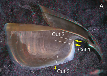 Figure. A - Lateral view of the left half of the beak showing where two longitudinal cuts were made. B - Dorsal-posterior view of the same beak fragment showing a different perspective of the Shoulder and Bridge.