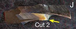 Figure. H - Similar view to Fig. G, with a more posterolateral tilt, taken after Cut 2 was made; the image shows where the two cuts were made on this beak fragment. I - Oral-lateral view of Cut 2. J - Oral (= ventral) view of Cut 2. K - Photomicrograph (2D), oral view taken perpendicular to cut surface.