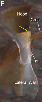 ARROWS: 3 - Wedge (= lobe 3). 5 - Middle lobe containing Hyaline Matrix (= lobe 5). 6 - Shoulder Blade. 9 - Groove where Free and Sessile Shoulders join. 10 - Edge of cut surface. 11 - Ventral edge of the Palatoshoulder Ridge. Yellow arrows - Point to same spot on all beaks.This cut missed most of the Fused Shoulder. The cut does show the structure of the Free Shoulder including the Shoulder Blade (6), the Wedge (3), and lobe 5 (containing most of the Hyaline Matrix) which lies mostly in the Free Shoulder. The Wedge is a thick pigmented area that lies under most of the thin Shoulder Blade. The growth lines of the Wedge are concave relative to the lateral surface of the Shoulder and accentuate the size of the Step. Much of the structure surrounding lobe 5 is difficult to interpret. Laterally it appears to be bound by a ventral extension of the Wedge that further on dissipates into the Hyaline Matrix (Figs. D, especially E).