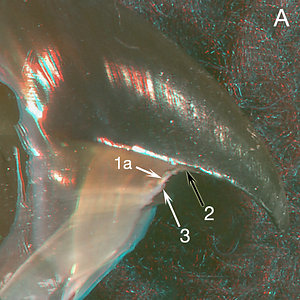 Cut 3 was made to determine the extent of Hyaline Matrix along the ventral region of the beak compared to an extreme case in Lepidoteuthis. In the ventral part of the cut (2), the Hyaline Matrix is thicker than the pigmented layer of the Lateral Wall. Compare this with the Hyaline Matrix of a large Lepidoteuthis (C) taken from a sperm whale stomach: On the left side of the beak the Hyaline Matrix is white (presumably an artifact of whale digestion); on the right side the Hyaline Matrix is detectable as the yellow light penetrating the Lateral Wall pigment. The much thicker and more extensive Hyaline Matrix of the Lepidoteuthis beak provides an important difference to a beak which is otherwise very similiar an Octopoteuthis beak.